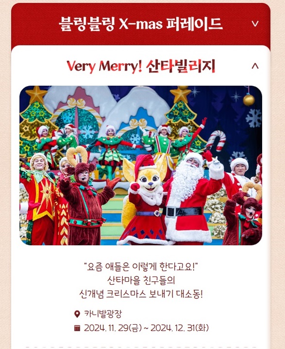 - 크리스마스 퍼레이드: 2024년 11월 29일(금) ~ 12월 31일(화)