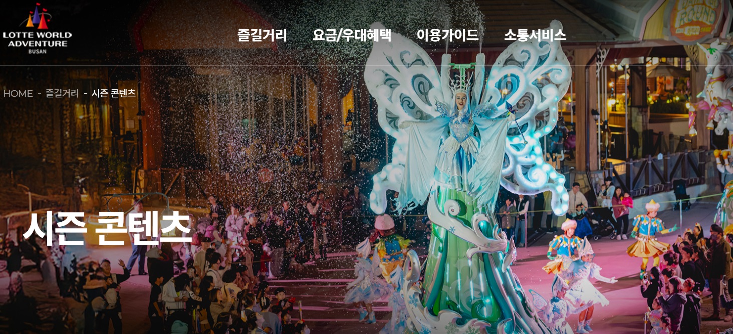 부산 롯데월드 크리스마스 데이트 & 가족 여행올겨울, 부산 롯데월드에서 사랑하는 사람들과 특별한 시간을 보내세요!행사 개요커플 데이트 코스가족 여행 프로그램할인 정보행사 진행 시간1. 행사 개요부산 롯데월드 어드벤처는 크리스마스를 맞아 동화 같은 겨울 축제를 준비했습니다. 2024년 11월 23일부터 12월 31일까지, 아름다운 트리 장식과 눈 내리는 퍼레이드, 불꽃놀이가 이어지는 '미라클 윈터 시즌'에 방문하세요.기간: 2024년 11월 23일 ~ 12월 31일장소: 부산 롯데월드 어드벤처하이라이트: 대형 트리, 퍼레이드, 불꽃놀이부산롯데월드 바로가기전국크리스마스행사 바로가기2. 커플 데이트 코스사랑하는 연인과 함께 부산 롯데월드에서 로맨틱한 크리스마스를 즐겨보세요. 저녁 불꽃놀이와 포토존에서 특별한 ..